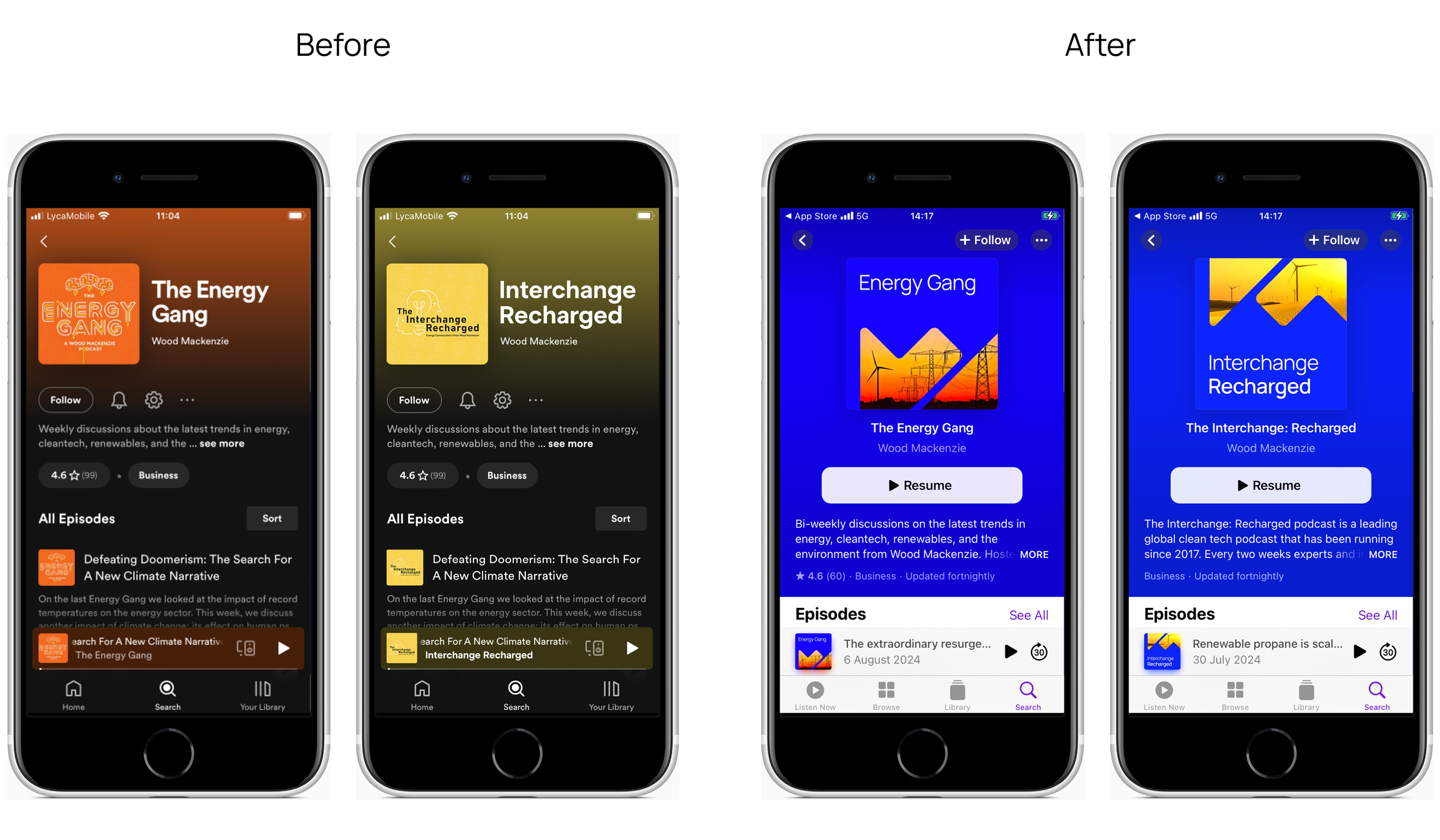 WoodMac has two podcasts that had a completely unique look and feel to each one. Over time, the colours for the podcast were recognisable to each of the podcasts. When WoodMac rebranded, we had to bring the two, very different, very colour led podcasts into the new brand identity whist still pulling them apart.